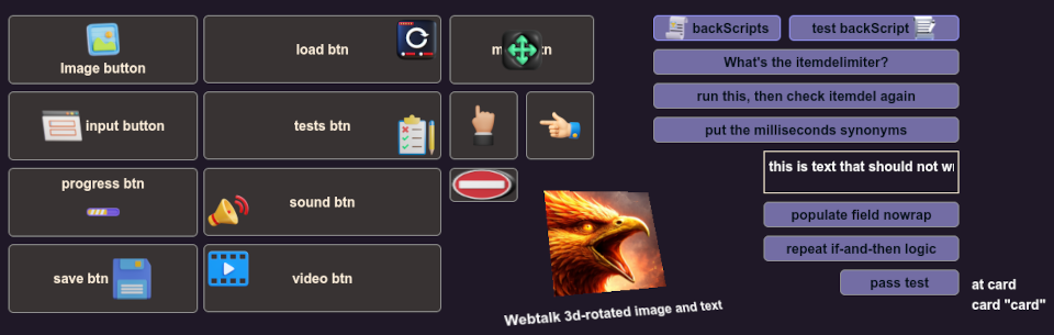 Webtalk is loosely based on the HyperTalk scripting language, and the goal is to be compatible in most major respects. There are additions to it and perhaps things missing from it. The boring bit is I'm not implying it's fit for any particular purpose, and there's no guarantees implied or otherwise about how it might run on your system. (Being based on Javascript and CSS, it heavily relies on what your browser is capable of).